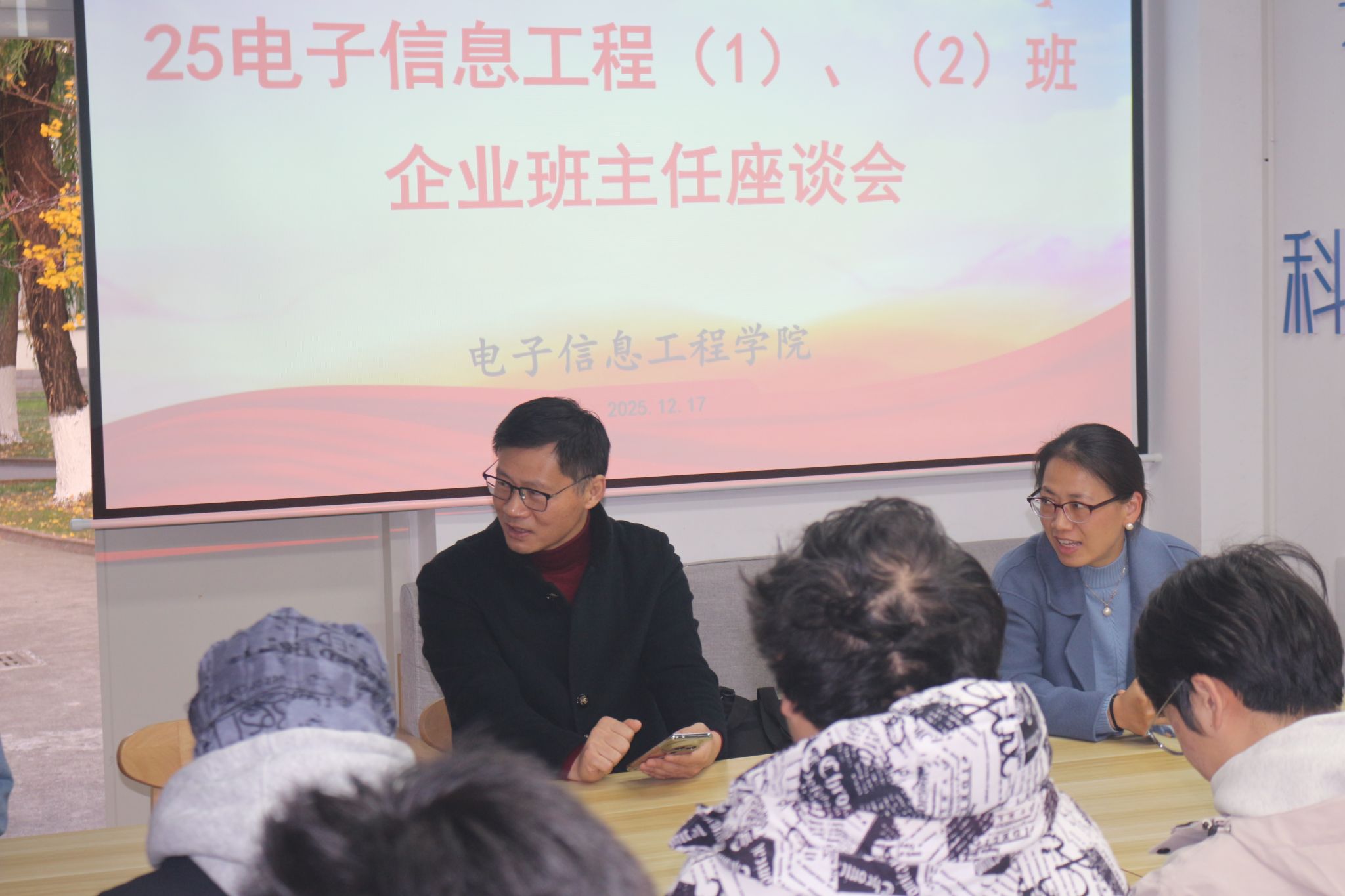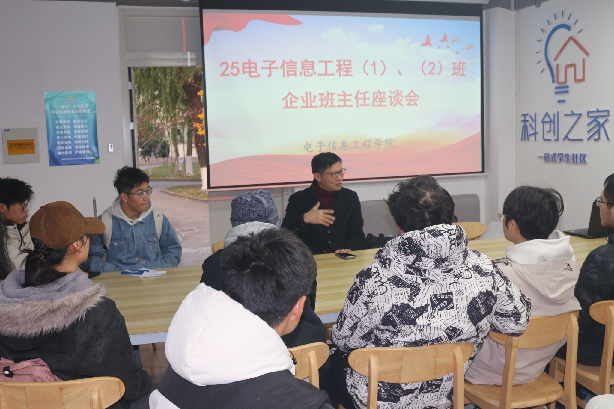 12月17日下午四点,电子信息工程学院企业班主任、南京优奈特信息科技有限公司董事长林新华应邀到北区02栋一站式开展了一场别开生面的师生座谈会,电信学院党委副书记陈智慧、25电子信息工程信息(1)(2)班学生代表欢聚畅聊。